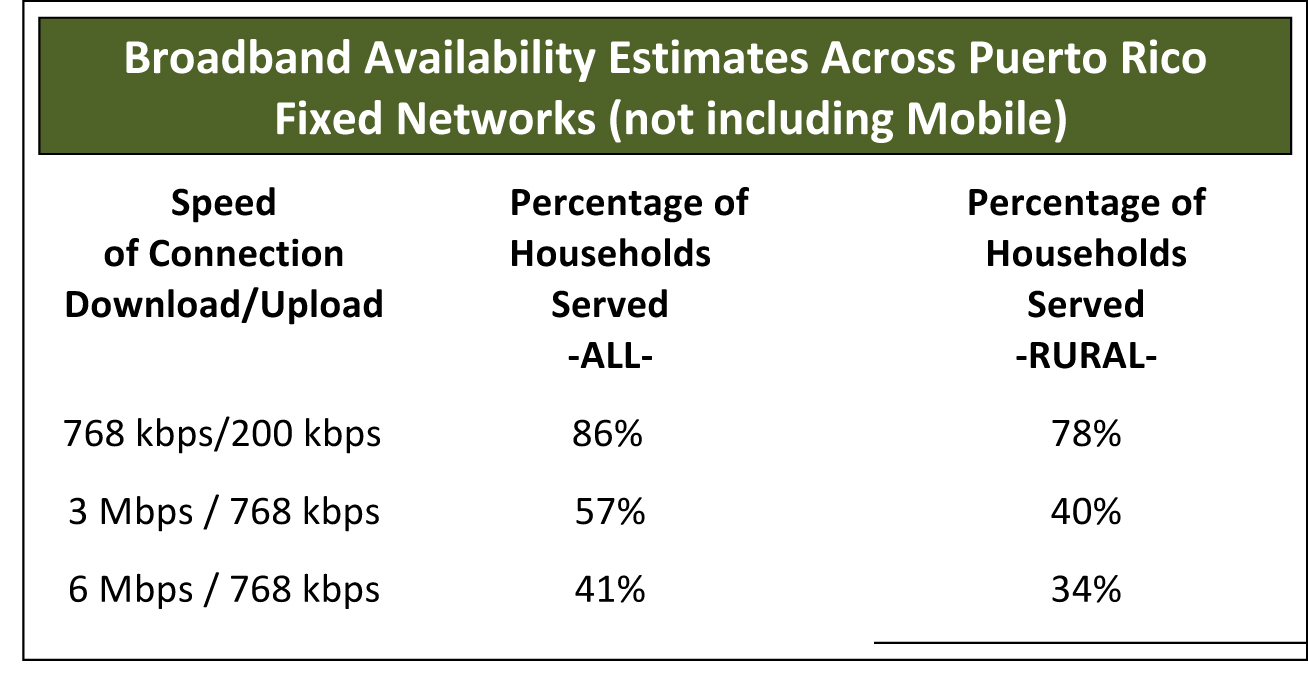 New data estimates indicate that 86% of households have broadband available at basic connection speeds (768 kbps download/200 kbps upload speeds). The estimate drops significantly when looking at higher connection speeds necessary to support Internet applications that consumers are increasingly demanding, such as video streaming. An estimated 41% of households across the island have broadband available at speeds of 6 Mbps/768 kbps or higher.