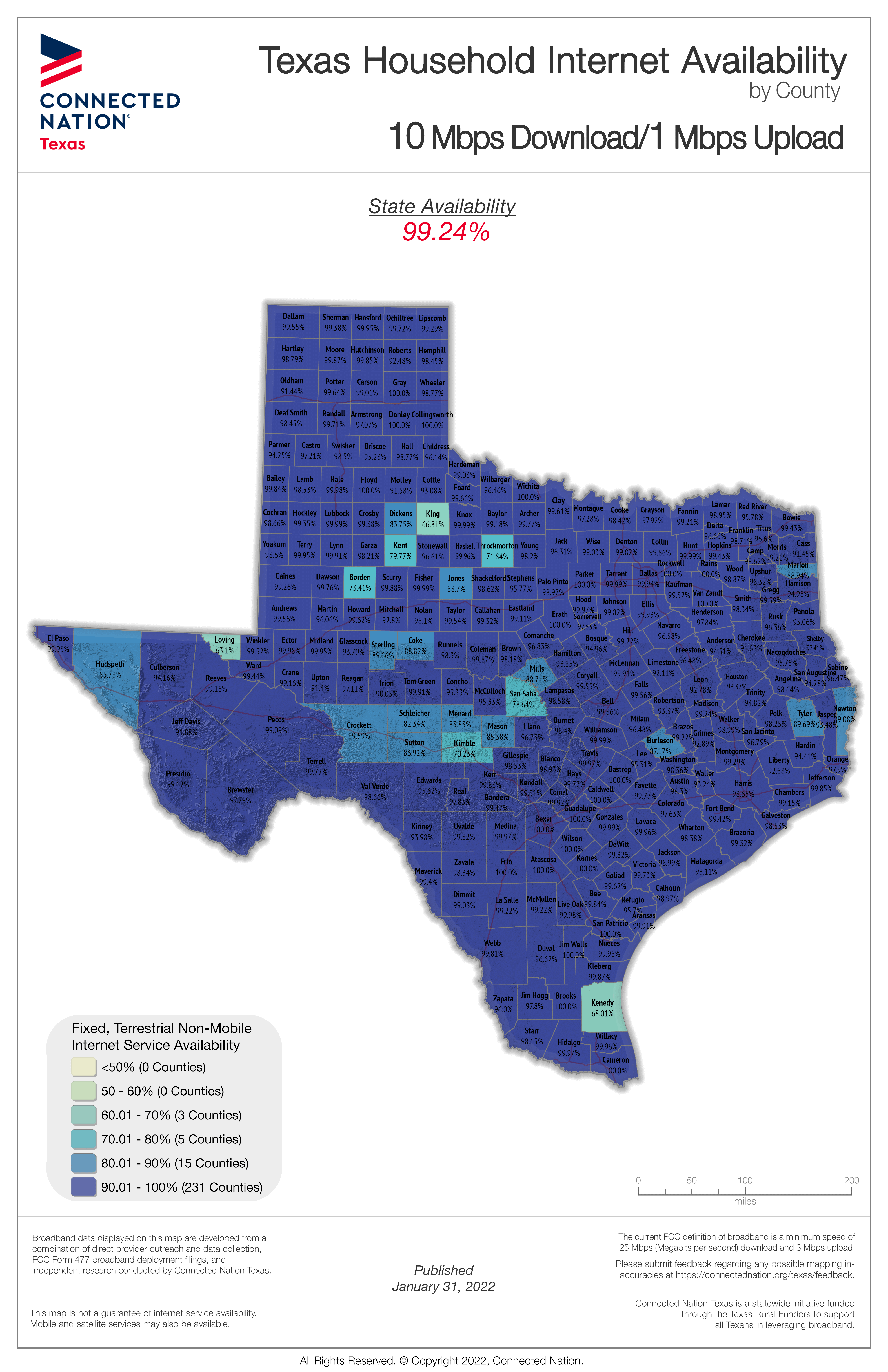 Texas Household Broadband Availability by County, at least 50x5 Mbps