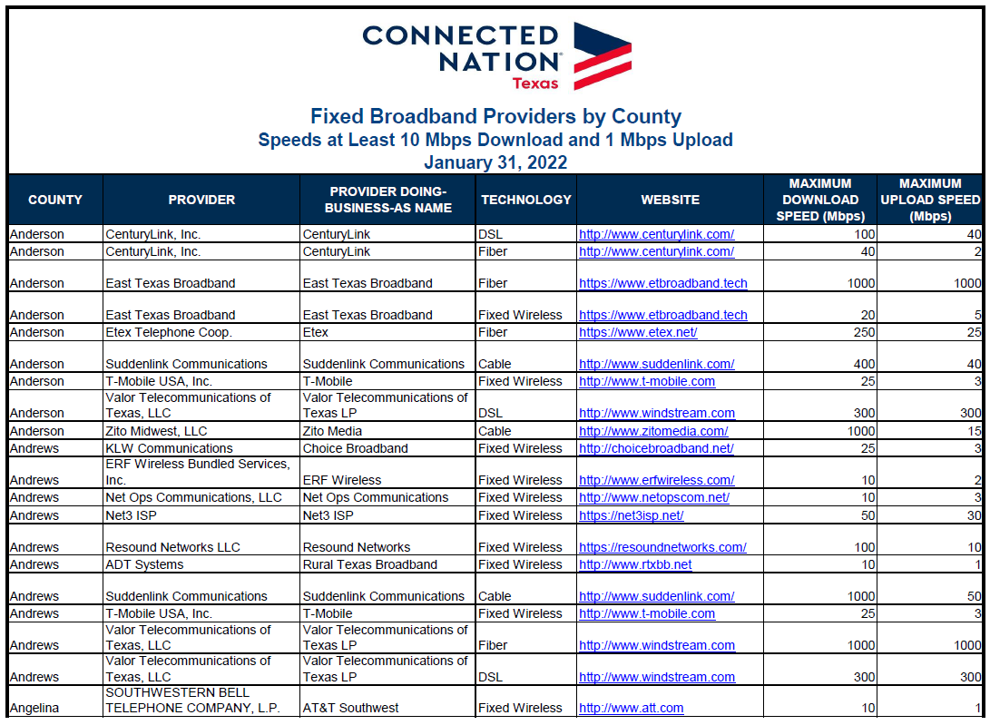 Texas Broadband Providers by County (PDF)